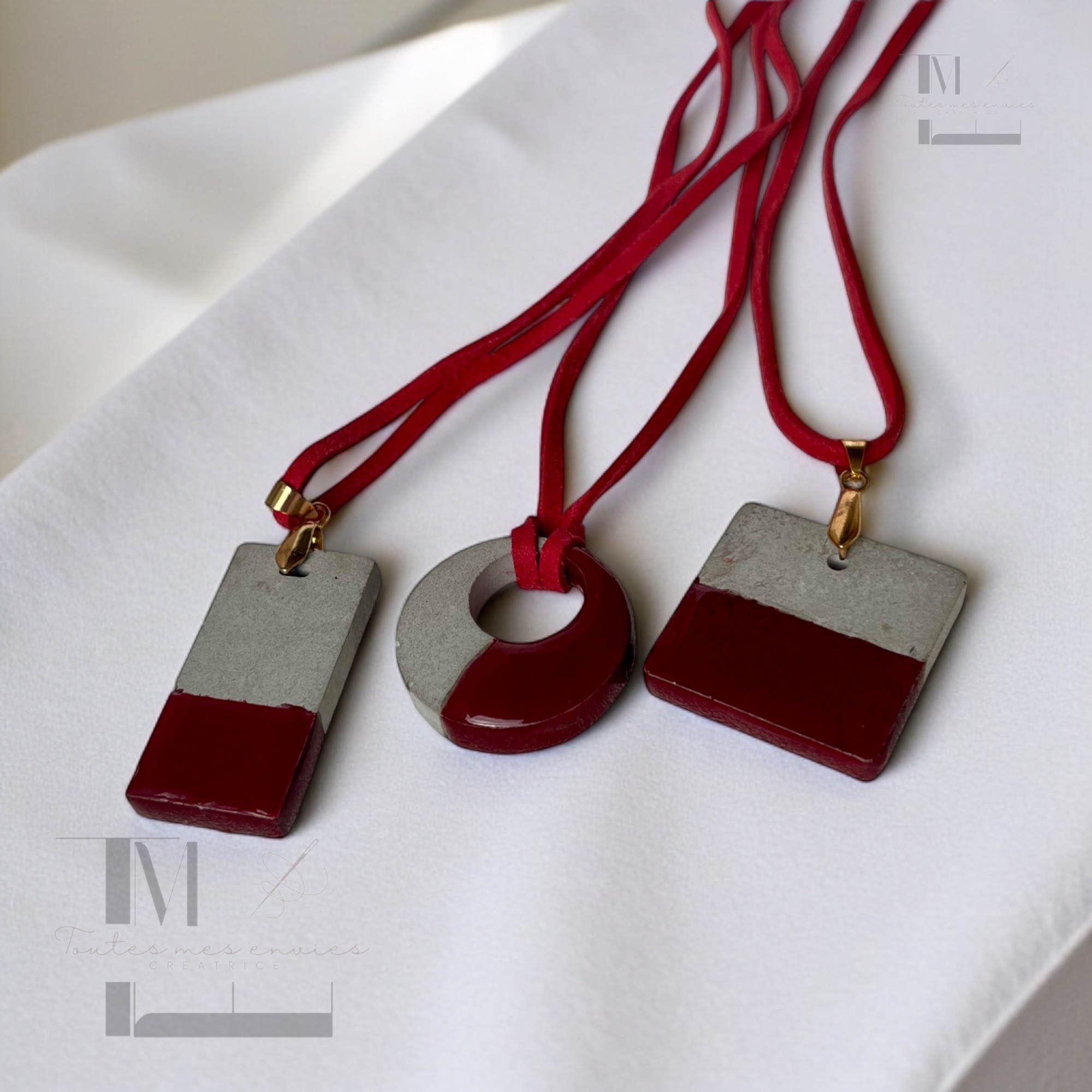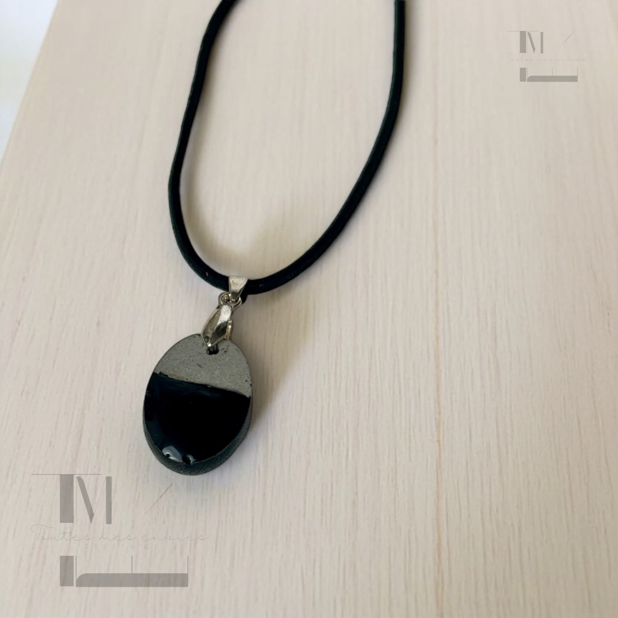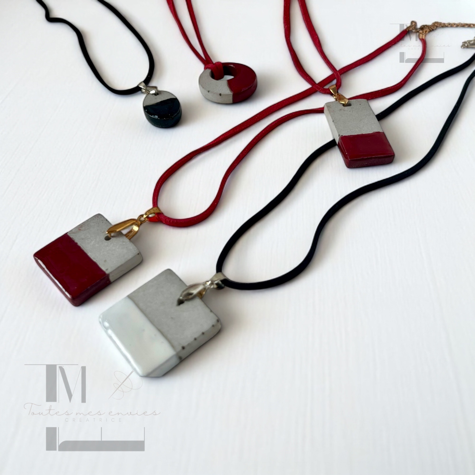 Ce bijou original est le résultat d’un travail minutieux entre la minéralité du béton et l’éclat de la résine. L’insert de résine colorée, disponible en blanc pur, noir profond, rouge passion ou cuivre lumineux, vient rehausser la surface du pendentif. De ce fait, un contraste subtil et élégant est créé, ajoutant une profondeur visuelle à l’ensemble.